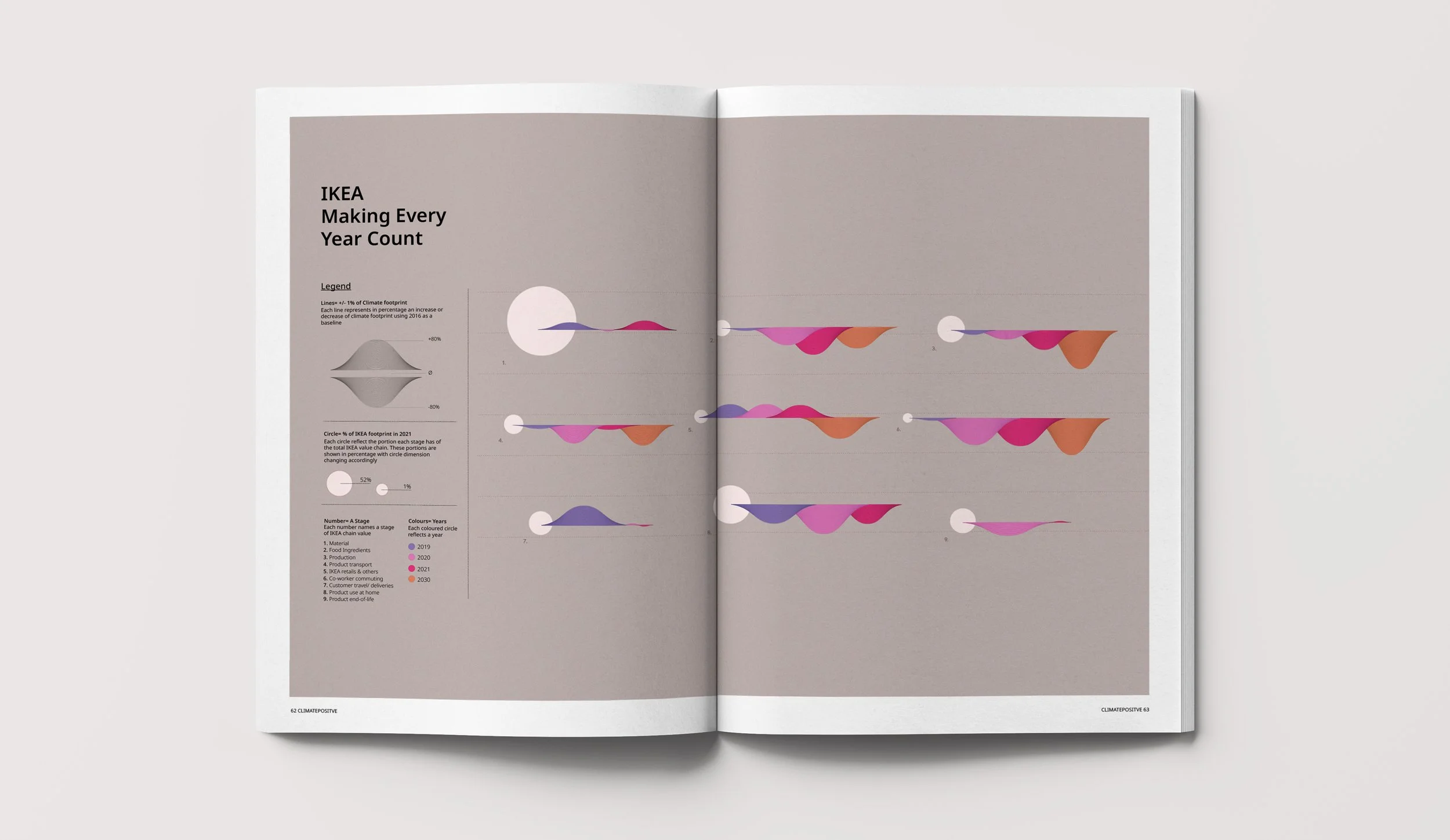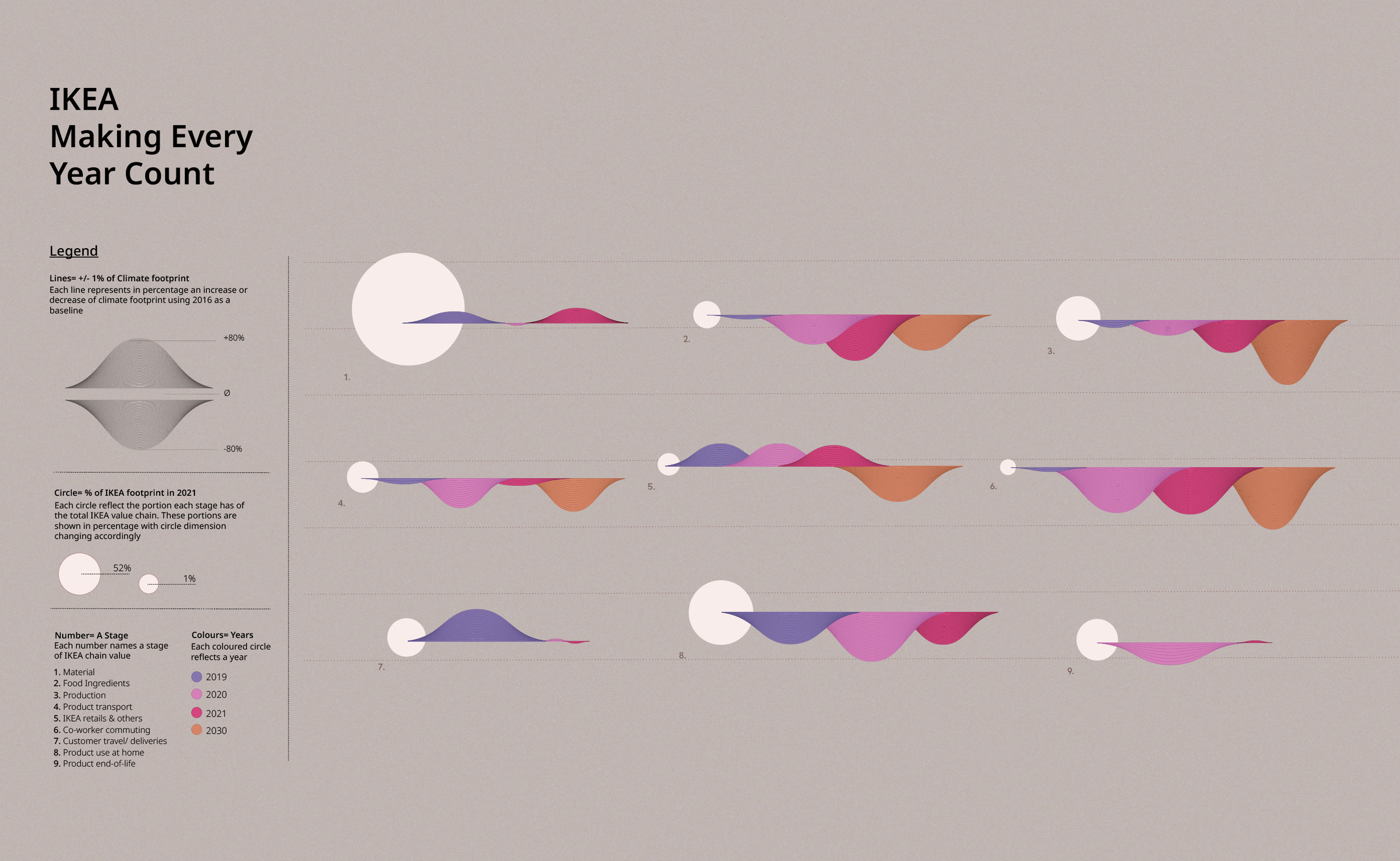 Climate change has been posing risks to businesses worldwide, however many companies do not identify the benefits that may arise from using climate change as an opportunity to build their brand in a positive manner. “Every year counts” is seen as a model tool to bring behaviour change to consumers, and a way to achieve a companies growth. From the amount of data found in the IKEA FY21 it has been decided to create “Every year counts” in two data visualisations, these two designs complete each other and provide a better understanding of the data together. These two data visualisations are intended to be displayed in IKEA stores and online and printed catalogs, however they mainly function as an immersive experience.